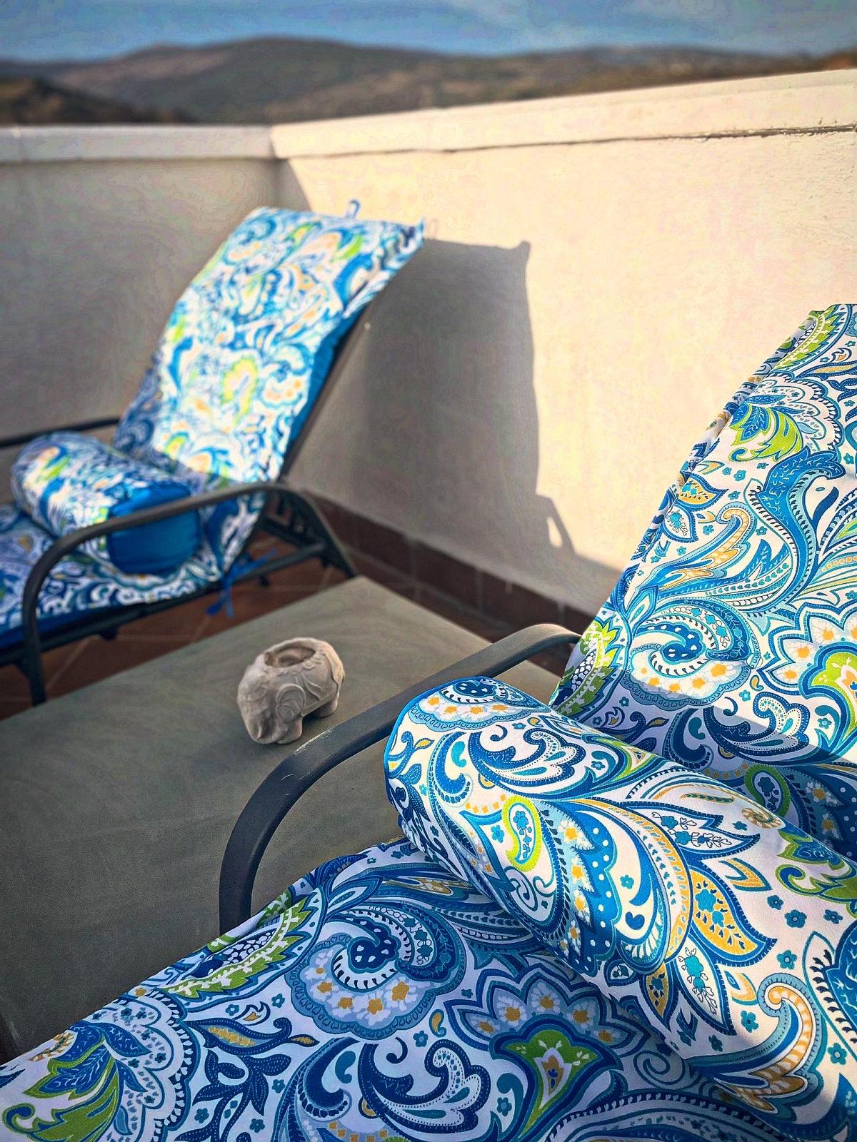 Terraza-mirador con acceso al jardín dotada de mobiliario para comer y sofá para descansar contemplando el paisaje.